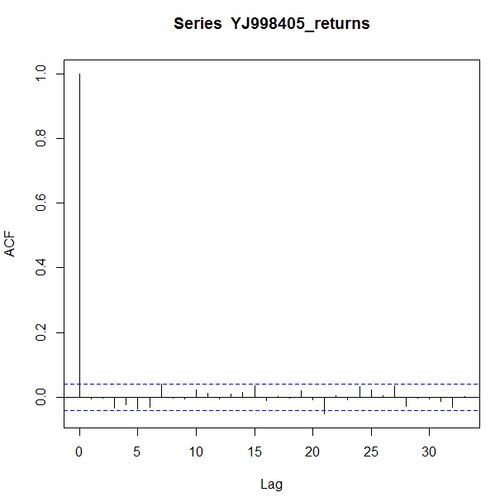 前回は相関についてメモした。前回のTOPIXのリターンデータの相関、2乗の相関、絶対値の自己相関をメモしておく。1次の自己相関。 > acf(YJ998405_returns) 2次の自己相関。 > acf(YJ998405_returns*YJ998405_returns) 絶対値の自己相関。 > acf(abs(YJ99840…