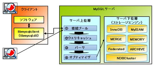 クライアントからのMySQLサーバへの接続、MySQLサーバでのSQLの解析・発行、MySQLサーバでのデータの保存は、次のようになっている。◎クライアント クライアント側でMySQLサーバと通信を行うインタフェースはlibmysqlclient(windowsの場合は、libmysql.dll)…