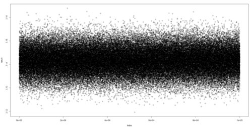 モンテカルロ法を使用して、息抜きにRで円周率の計算を行う。有名問題なので背景はこの辺を参照。 L=1 count = 1000000 x = runif(count,0,L) #0からLの間の乱数を発生させる y = runif(count,0,L) #0からLの間の乱数を発生させる pi = 4*sum(x**2+y**2